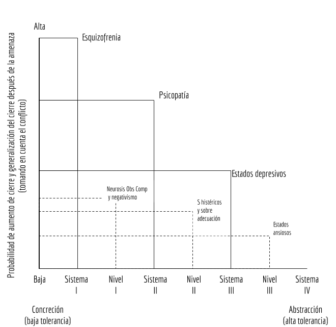Es probable que la observación del paciente y el terapeuta de aquellos conceptos – constructos más concretos les señale además cierta tendencia a la clausura en las aplicaciones (la observación conjunta de que no se ven más alternativas de construcción posible). Esto es esperable, y ni el terapeuta ni el paciente deberían obligarse a intentar cambiar o cuestionar esta clausura demasiado pronto. En las primeras sesiones, en cambio, resulta un paso adecuado el definir y registrar cuál es la mínima disposición efectiva a la apertura, es decir qué tan dispuesto está el paciente a intentar abrir la aplicación de de constructos, en términos del grado inmediatamente superior de abstracción (mínimo costo personal).